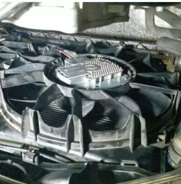 接上羅賓奈爾AC350回收加注一體機(jī),發(fā)現(xiàn)高壓側(cè)壓力達(dá)2000kPa之多,且有緩慢攀升之勢,趕緊關(guān)閉空調(diào),發(fā)現(xiàn)左散熱風(fēng)扇不轉(zhuǎn),發(fā)現(xiàn)了故障點(diǎn),人為向冷凝器澆灑大量水,高壓側(cè)壓力回到1450kPa,系統(tǒng)制冷正常,出風(fēng)口溫度降到6℃,看來左風(fēng)扇不轉(zhuǎn)是核心故障點(diǎn),風(fēng)扇位置如圖1所示。
