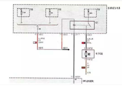 在思索的過(guò)程中,在發(fā)動(dòng)機(jī)前四處觀察各部件的時(shí)候,無(wú)意中看到電子扇上面有2條線,2條線就通常意味著只有一級(jí)控制或者通過(guò)電子風(fēng)扇控制模塊進(jìn)行控制。為驗(yàn)證上述兩種可能性,在發(fā)動(dòng)機(jī)艙內(nèi)找到保險(xiǎn)絲繼電器盒總成,發(fā)現(xiàn)里面只有一個(gè)電子風(fēng)扇的繼電器和保險(xiǎn)絲,那么可以推測(cè)電子風(fēng)扇很有可能只有一級(jí)控制,而且是由DME直接控制的。因?yàn)榇嬖陔娮语L(fēng)扇控制模塊的話,應(yīng)該不設(shè)置有電子風(fēng)扇繼電器這一過(guò)渡性器件,如圖4所示。