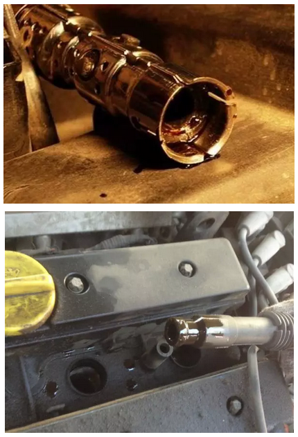 由于氣門室長期溫度較高,塑料成分的氣門室蓋和氣門室墊,會(huì)老化。氣門室蓋和氣門室墊之間的縫隙越來越大,氣門室中的機(jī)油透過不密封的氣門室墊,跑到火花塞護(hù)管的里面,累積起來。機(jī)油日積月累,少的可能幾滴機(jī)油,嚴(yán)重的會(huì)是這樣,都有幾十毫升了。