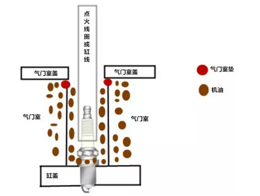 在發(fā)動(dòng)機(jī)內(nèi)循環(huán)使用中的機(jī)油,含有碳、金屬顆粒、灰塵等各種雜質(zhì)、離子,而火花塞及點(diǎn)火線圈的工作電壓是在1-3萬伏,所以此時(shí)機(jī)油可能變成一定程度上的導(dǎo)體。當(dāng)火花塞及點(diǎn)火線圈(缸線)的橡膠部分浸泡在機(jī)油里時(shí),機(jī)油會(huì)使得點(diǎn)火線圈(缸線)的橡膠部分失去正常的絕緣性,造成擊穿的風(fēng)險(xiǎn),機(jī)油也會(huì)增大火花塞陶瓷爬電、擊穿的可能性,造成發(fā)動(dòng)機(jī)抖動(dòng),運(yùn)行無力等癥狀。