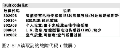 連接ISTA,對車輛進(jìn)行診斷,讀取到的故障代碼如圖2所示。用ISTA對故障代碼存儲(chǔ)器進(jìn)行分析,發(fā)現(xiàn)存在當(dāng)前故障“CD9304 BSD總線:通信故障”,故障頻率計(jì)數(shù)為10。