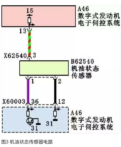 連接專用適配器,對照機(jī)油狀態(tài)傳感器的相關(guān)電路(圖3),測得機(jī)油狀態(tài)傳感器的供電電壓為12.8 V;測量導(dǎo)線連接器X62540的端子2與搭鐵之間的電阻,為0.2 Ω;測量導(dǎo)線連接器X62540的端子1在KL.15電源接通情況下的電壓,為0.65V,異常(正常應(yīng)約為10 V);用IMIB測量BSD總線的波形,波形為一條直線,異常。