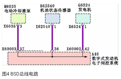 發(fā)電機(jī),電動(dòng)冷卻液泵和機(jī)油狀態(tài)傳感器是通過BSD總線與DME連接,當(dāng)BSD總線有故障時(shí),會(huì)影響車載電壓,機(jī)油狀態(tài)傳感器也無法正常測量機(jī)油油位。當(dāng)檢測到BSD總線存在故障時(shí),DME會(huì)進(jìn)入應(yīng)急模式,保護(hù)發(fā)動(dòng)機(jī)。在應(yīng)急模式下散熱風(fēng)扇會(huì)高速運(yùn)轉(zhuǎn)。