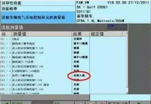 3、檢查 09-中央電器控制單元 P/N 檔信號數(shù)據(jù)流 64 組第一區(qū),檔位位于 P/N 檔時,顯示未掛 入(見圖 1),正常情況應(yīng)該顯示已掛入;