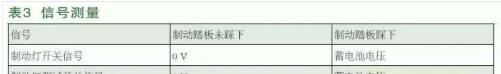 在制動(dòng)燈開關(guān)的兩個(gè)輸出口可以測(cè)量信號(hào)電平,如表3所示。