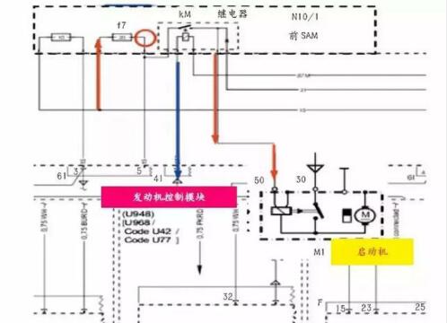 根據(jù)電路圖(如圖5所示),在前SAM內(nèi)M位置,找到啟動(dòng)機(jī)繼電器,測量30號(hào)的電源,發(fā)現(xiàn)無電源,給87號(hào)腳供電,啟動(dòng)機(jī)轉(zhuǎn)動(dòng),說明啟動(dòng)機(jī)及電路正常。檢查30號(hào)電源的上游保險(xiǎn)f7,發(fā)現(xiàn)保險(xiǎn)虛接。