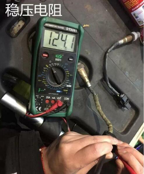 為了查明是什么原因?qū)е卵鮽鞲衅魇チ俗兓匦?,我將氧傳感器拆下來對穩(wěn)壓電阻進(jìn)行了測試,前氧的穩(wěn)壓電阻一度達(dá)到了124歐姆.