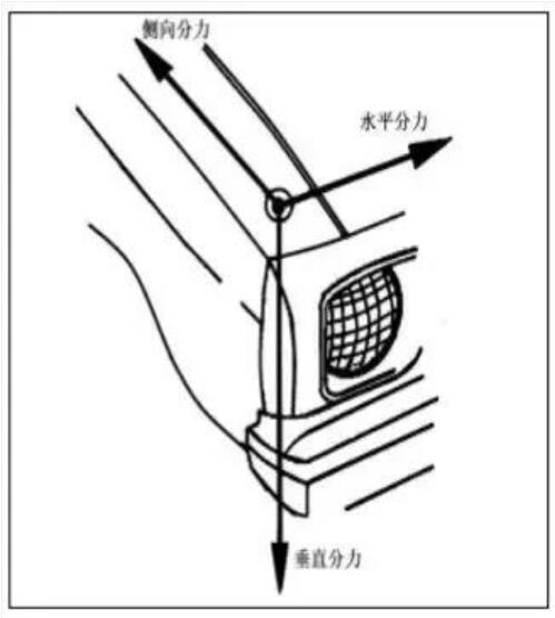 分解碰撞力時可將碰撞力分解為三維尺寸上的三個值:垂直 分力、水平分力及側(cè)向分力。垂直分力可使汽車身高度的尺寸發(fā) 生變化,水平分力會造成車身寬度的變化,側(cè)向分力會造成車身 長度的變化,如圖2所示。 車身維修人員在對車輛進(jìn)行測量分析時,經(jīng)常會只運用點對 點測量或?qū)蔷€測量,但實際上這只是進(jìn)行了長度和寬度方向的測 量,而忽視了高度方向的測量和調(diào)整。