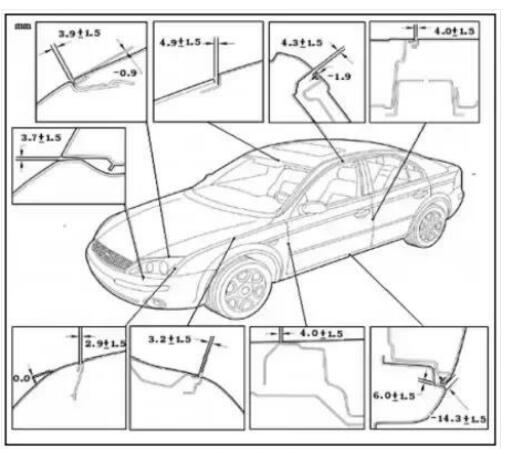 如圖6所示,車門、翼子板、發(fā)動機罩、行李箱蓋等之間的 配合間隙都有一定的要求,通過觀察、對比或測量它們之間間隙 的變化可以判定哪些發(fā)生了變形。對比左右翼子板與發(fā)動機罩的 間隙情況,可通過簡單地開關(guān)車門及觀察門的準(zhǔn)直來確定車身立 柱是否受到損傷。