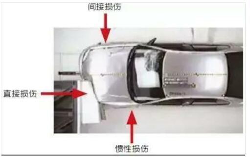 當(dāng)汽車受到碰撞時,質(zhì)量大的部件(如發(fā)動機)的慣性會使其 向相反方向移動而發(fā)生沖擊,產(chǎn)生慣性損傷,故需對固定件、周 圍部件及板件進(jìn)行檢查,當(dāng)然精確的損傷評估還要靠精確的車身 三維測量來確定。