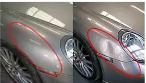 免漆凹陷修復(fù)技術(shù)是運用光學(xué)、力學(xué)及化學(xué)等多方面技術(shù)原 理,對未損傷車漆的凹陷部位通過局部的特殊工藝進(jìn)行修復(fù),避 免了烤漆所造成的漆霧、流掛、色差、色變、桔皮等缺陷,無需 傳統(tǒng)的鈑金、噴漆就可以達(dá)到幾乎100%復(fù)原,如圖8所示。它操 作雖簡單,但可以讓車輛恢復(fù)原有狀態(tài),極大縮短了修復(fù)時間, 具備傳統(tǒng)鈑金技術(shù)無法比擬的優(yōu)勢。但免漆凹陷修復(fù)存在一些缺 陷,例如,凹陷發(fā)生的部位不同,維修的難易程度也不同,個別 部位因內(nèi)襯和加強筋等問題,導(dǎo)致維修難度過大,甚至需要破除 才能方便維修,也可能產(chǎn)生無法維修的情況。