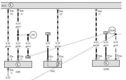② 根據(jù)故障記錄,檢查凸輪軸位置傳感器及線路(下圖),本車同時采用進氣與排氣凸輪軸正時調(diào)節(jié)裝置,兩個凸輪軸由兩個位置傳感器G40和G300進行監(jiān)控,經(jīng)檢查傳感器插頭連接完好,傳感器無缺損及直觀故障,接著分別測量G40和G300的插頭線路,兩個傳感器插頭針腳,1號針腳為供電線,3號針腳為搭鐵線,2號針腳為傳感器的反饋信號端子,分別測量兩傳感器的1號針腳,電壓為5V(正常),測量3號針腳對地電阻為0.2Ω,說明兩傳感器的搭鐵正常,用替換法對傳感器進行驗證,傳感器工作正常。