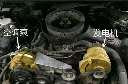 空調(diào)泵和發(fā)電機(jī)分別被放置在了發(fā)動(dòng)機(jī)的兩側(cè),這種設(shè)計(jì)在現(xiàn)在基本上已經(jīng)很難再看到了,空調(diào)泵基本上都被隱藏在了發(fā)動(dòng)機(jī)艙的最下方。對(duì)于空調(diào)泵右側(cè)這塊白色的板子是空調(diào)泵的支架,沒(méi)錯(cuò)就是這么大。二十幾年前的冶金行業(yè)的技術(shù)還不夠發(fā)達(dá),沒(méi)法制造出高強(qiáng)度的金屬支架。用一句話來(lái)形容就是那個(gè)年代基本上所有的東西都是傻大傻大的。