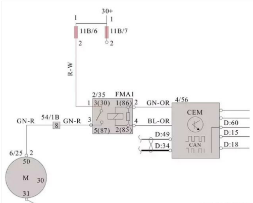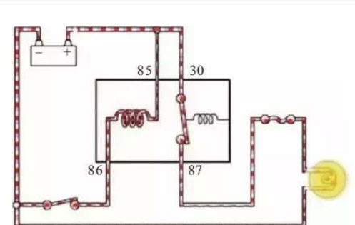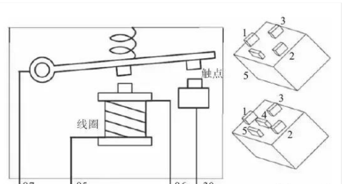 引觸點的87#和30#端子,使繼電器的觸點閉合,從而實現(xiàn)小電流控制大電流。
