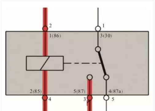 五腳繼電器工作原理與四腳繼電器基本相同,只是在繼電器不工作的時候有一觸點一直處于常閉狀態(tài)。如下圖所示,當(dāng)繼電器線圈85#和86#端子通電后,線圈吸引觸點從87a#端子運動到87#端子,使30#端子與87#端子接通,所以五腳繼電器也叫做樞紐繼電器,可以起到一個轉(zhuǎn)換的功能。
