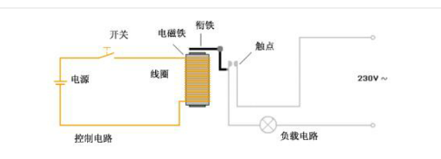 繼電器主要應(yīng)用的是電磁效應(yīng)。線圈供電后產(chǎn)生的磁場使觸點閉合,如下圖所示。