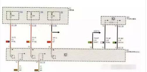 試車回來后,對(duì)照電路圖檢查,發(fā)現(xiàn)熔絲F2除了給DSC供電外,還有一個(gè)分路,在電路圖中只是一個(gè)箭頭而已(圖1)。擴(kuò)大電路圖的查找范圍,發(fā)現(xiàn)此處的電源是送給4個(gè)門外把手的。聯(lián)想到用戶提到乘客多時(shí)故障容易出現(xiàn),推測(cè)問題應(yīng)該與多個(gè)車門被打開有關(guān)。