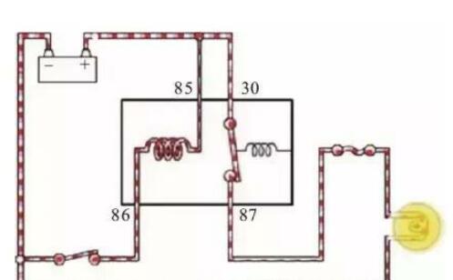 車輛繼電器多為四腳,工作原理如下圖所示。當開關(guān)閉合后電流從蓄電池正極經(jīng)過繼電器的85#線圈端子從86#流回蓄電池的負極,線圈兩端就會產(chǎn)生磁場。線圈產(chǎn)生磁場后,就會吸引觸點的87#和30#端子,使繼電器的觸點閉合,從而實現(xiàn)小電流控制大電流。