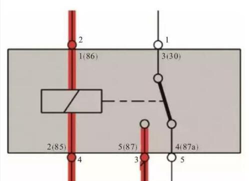 五腳繼電器工作原理與四腳繼電器基本相同,只是在繼電器不工作的時候有一觸點一直處于常閉狀態(tài)。如下圖所示,當繼電器線圈85#和86#端子通電后,線圈吸引觸點從87a#端子運動到87#端子,使30#端子與87#端子接通,所以五腳繼電器也叫做樞紐繼電器,可以起到一個轉(zhuǎn)換的功能。