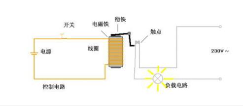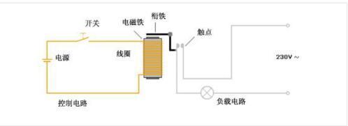 繼電器主要應(yīng)用的是電磁效應(yīng)。線圈供電后產(chǎn)生的磁場使觸點閉合,如下圖所示。