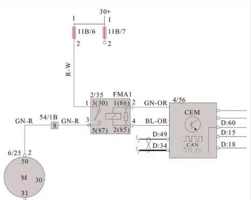 繼電器在汽車電路中的應(yīng)用非常廣泛。如啟動系統(tǒng)電路、雨刮器電路、后窗加熱電路等。車輛啟動時需要大的啟動電流,如果使用點火開關(guān)直接控制大電流經(jīng)過的點火開關(guān),啟動觸點會出現(xiàn)觸點打火、燒蝕等現(xiàn)象,影響點火開關(guān)使用壽命甚至會造成線路燒蝕、起火等嚴重后果。使用繼電器以小電流控制大電流則不會出現(xiàn)以上問題。