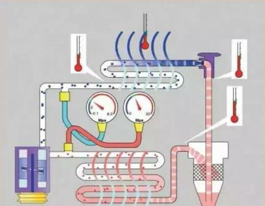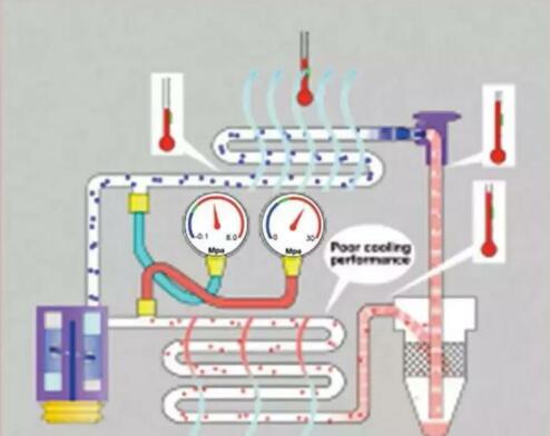 制冷劑過量會(huì)造成系統(tǒng)液態(tài)制冷劑過多,且循環(huán)不良,從而引起系統(tǒng)管路壓力偏高,需回收制冷劑、抽真空后,再按要求定量加注。