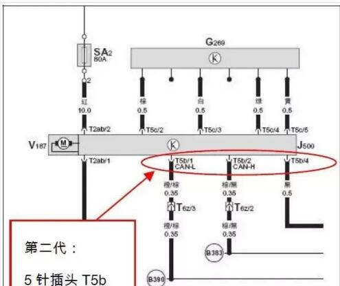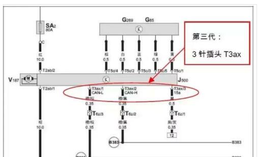 另,自2008 年10 月起,途安方向機(jī)由第二代切換到第三代,兩者主要區(qū)別為第三代方向機(jī)轉(zhuǎn)向角度傳感器G85 是安裝在方向機(jī)上的,原5 針插頭T5b 替換為3 針插頭T3ax,見(jiàn)下圖。