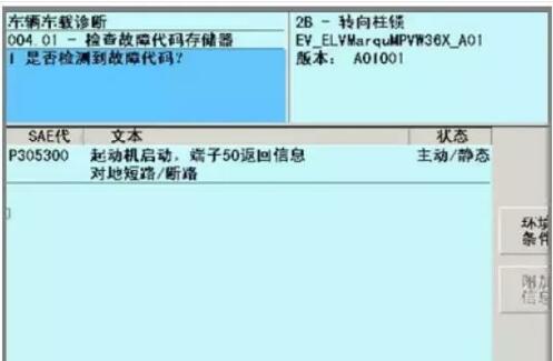 儀表中轉(zhuǎn)向黃燈報(bào)警。2B 控制單元中有故障碼:P30530 起動(dòng)機(jī)啟動(dòng),端子50 返回信息對(duì)地短路/斷路 主動(dòng)/靜態(tài)。
