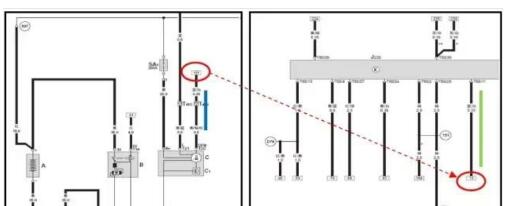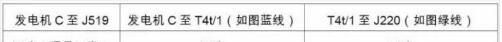 4、查閱電路圖,測(cè)量發(fā)電機(jī)到發(fā)動(dòng)機(jī)控制單元之間的信號(hào)線,電阻無(wú)窮大,線束斷路。(見(jiàn)下圖)