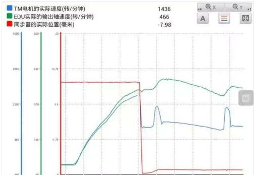 首先是TM電機(jī)的實(shí)際轉(zhuǎn)速與EDU實(shí)際輸出的轉(zhuǎn)速之間的關(guān)系,作者沒(méi)有說(shuō)明,就導(dǎo)致無(wú)法進(jìn)一步深入分析。這里,我們按照作者圖 片中顯示的圖形的速比,按照1:6.5進(jìn)行分析,2擋時(shí)按1:3進(jìn)行分析。 比如,在1擋時(shí),TM電機(jī)的實(shí)際轉(zhuǎn)速與EDU實(shí)際的輸出轉(zhuǎn)速偏差不大,這說(shuō)明,C2離合器沒(méi)有明顯打滑現(xiàn)象。掛入2擋時(shí),EDU實(shí)際      的輸出轉(zhuǎn)速上升不明顯,但此時(shí)可以看到TM電機(jī)的轉(zhuǎn)速已經(jīng)有所降低。其中有兩處出現(xiàn)異常上升點(diǎn),分別在866:28以及866:44附近,此時(shí)    TM電機(jī)速度達(dá)到2 100r/min左右,但EDU實(shí)際輸出轉(zhuǎn)速上升幅度不大(大概在470r/min左右),此時(shí)的速比大概為1:4.7左右,超出了2擋的 速比(1:3)。這個(gè)位置應(yīng)該就是電腦檢測(cè)到的打滑點(diǎn),因此,電控單元判斷出現(xiàn)了C2離合器打滑的故障,點(diǎn)亮故障燈,儀表臺(tái)提示混合動(dòng)力系  統(tǒng)故障,同時(shí),抑制電機(jī)功率的輸出,導(dǎo)致車(chē)輛只能以恒定車(chē)速運(yùn)行。