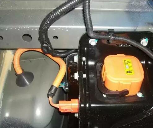 3.斷開(kāi)手動(dòng)維修開(kāi)關(guān)后,等待5min     左右方可進(jìn)行維修作業(yè),該車(chē)的手動(dòng)維修  開(kāi)關(guān)為橙黃色(圖5),安裝在右后車(chē)輪的  底盤(pán)處;