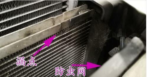 看下圖冷凝器有油跡的地方,防護(hù)網(wǎng)本來用扎帶固定的,扎帶老化斷裂后,導(dǎo)致行車過程中,在風(fēng)里的作用下,防蟲網(wǎng)前后拍打冷凝器,最終導(dǎo)致該位置出現(xiàn)泄露。