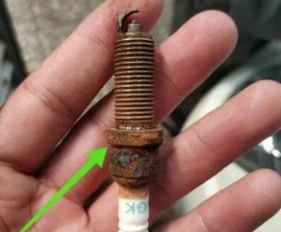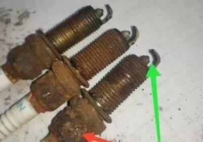 師傅分析發(fā)動(dòng)機(jī)失火最可能的原因是火花塞或點(diǎn)火線圈有問(wèn)題,師傅決定先檢查火花塞。沒(méi)想到的是,師傅看到拆下來(lái)的點(diǎn)火線圈和火花塞后,真是驚呆了!如下圖綠色箭頭所示,黑色的點(diǎn)火線圈已經(jīng)變成褐色;紅色箭頭所示的火花塞,也已經(jīng)變成了褐色!