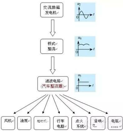 汽車上的發(fā)電機(jī)的電都是整流后輸出的直流,電瓶本身就是一個(gè)整流、穩(wěn)壓、濾波很好的設(shè)備。