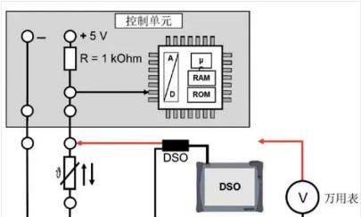 在掌握負溫度系數(shù)傳感器的工作原理后,結合監(jiān)測點電壓測量與數(shù)據流讀取可以有效地判斷故障點,在測量電壓時應注意使用VAS1594輔助測量線。