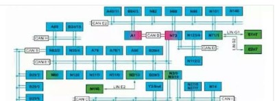 故障碼太多,況且故障現(xiàn)象又不出現(xiàn),一時不能確定故障范圍。首先拆掉右前側地毯,檢查了與故障碼相關控制模塊的CAN線分配器,未發(fā)現(xiàn)異常。檢查蓄電池兩個極樁,未發(fā)現(xiàn)松動,故障排除一時沒有了方向。因為是剛買了2天的新車,某個控制模塊損壞或者是線束磨損的可能性都是非常小的。況且在低速時故障現(xiàn)象又不會出現(xiàn),如果逐個斷開控制模塊去試車,就需要太長時間,客戶也不一定能夠接受。只好從故障碼中尋找突破口。從故障碼中看出,只有底盤CAN報了總線關閉的故障碼,其他控制模塊都是報通信存在故障,于是準備從底盤CAN(CAN E)上入手檢查。