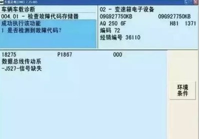 接車(chē)后,經(jīng)檢查發(fā)現(xiàn),車(chē)輛的儀表板上擋位指示呈紅色,由此說(shuō)明變速器進(jìn)入了故障應(yīng)急模式。對(duì)于09G自動(dòng)變速器,進(jìn)入應(yīng)急狀態(tài)時(shí)僅能在3擋及R擋工作,因此油耗近期異常加大的現(xiàn)象也就不難理解了。連接故障診斷儀VAS5052A,進(jìn)入網(wǎng)關(guān)列表,在02變速器電子系統(tǒng)中檢查到“數(shù)據(jù)總線傳動(dòng)系統(tǒng)J527信號(hào)缺失”的故障碼,并且不能清除(圖1)。