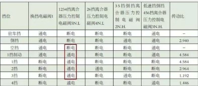 查閱維修手冊中的各個電磁閥的工作邏輯圖(如表1所示),1~4擋都由離合器壓力控制電磁閥5的通電方能正常工作(見紅色方框)。