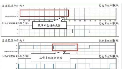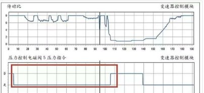查看油壓開關4的工作狀態(tài),為一條直線(如圖4所示中方框),沒有壓力過來,也就是有可能是壓力控制電磁閥5過來的油壓沒有,或是1234擋控制閥卡滯在關閉位置,所以油壓開關4壓力一直為高,沒變化。