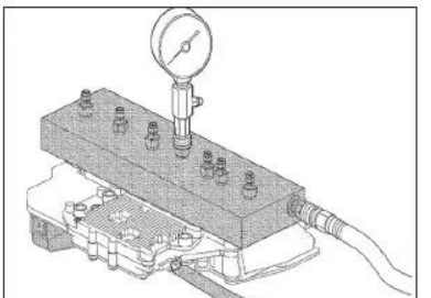 用螺栓將DT-48616 測試板安裝至控制電磁閥(帶閥體和變速器控制模塊)總成的閥體安裝表面,如圖6所示。壓縮氣體被送入鋁制測試盒,通過控制電磁閥(帶閥體和變速器控制模塊)總成電磁閥通道,返回測試盒上的一個壓力表中。如果空氣壓力通過電磁閥,壓力表指示打開;若空氣無法通過電磁閥,則指示關閉。使用故障診斷儀指令電磁閥通電或斷電。觀察壓力表時,可以確定閥的功能是否正常。