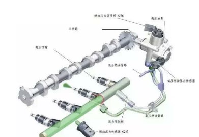 仔細觀察發(fā)現(xiàn)這款發(fā)動機與變速器之間除了擋板外,還有一個調節(jié)間歇用的鋁支架,擋板變形幾率比較小。仔細聽診發(fā)現(xiàn)異響確實來自發(fā)動機后部,難道是調節(jié)器鏈條的張緊器壞了?用診斷儀檢測,又發(fā)現(xiàn)了一個燃油軌道壓力低的偶發(fā)故障。該故障車的發(fā)動機排氣凸輪軸,通過調節(jié)器用鏈條帶動進氣凸輪軸和高壓油泵工作凸輪工作。難道是這個系統(tǒng)工作不正常,造成異響進而影響了高壓油泵的工作壓力?