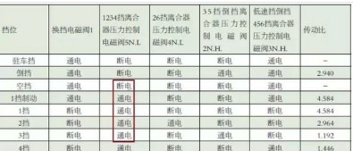 查閱維修手冊中的各個電磁閥的工作邏輯圖(如表1所示),1~4擋都由離合器壓力控制電磁閥5的通電方能正常工作(見紅色方框)。