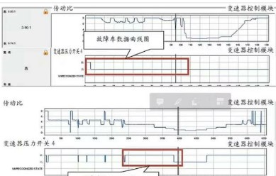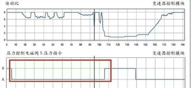 查看油壓開關(guān)4的工作狀態(tài),為一條直線(如圖4所示中方框),沒有壓力過來,也就是有可能是壓力控制電磁閥5過來的油壓沒有,或是1234擋控制閥卡滯在關(guān)閉位置,所以油壓開關(guān)4壓力一直為高,沒變化。