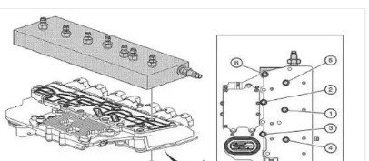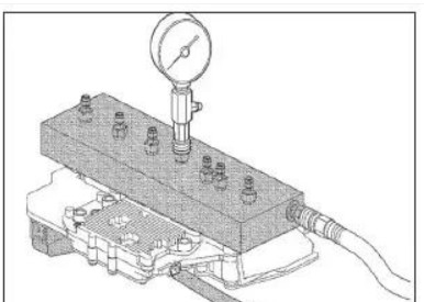 用螺栓將DT-48616 測試板安裝至控制電磁閥(帶閥體和變速器控制模塊)總成的閥體安裝表面,如圖6所示。壓縮氣體被送入鋁制測試盒,通過控制電磁閥(帶閥體和變速器控制模塊)總成電磁閥通道,返回測試盒上的一個壓力表中。如果空氣壓力通過電磁閥,壓力表指示打開;若空氣無法通過電磁閥,則指示關(guān)閉。使用故障診斷儀指令電磁閥通電或斷電。觀察壓力表時,可以確定閥的功能是否正常。