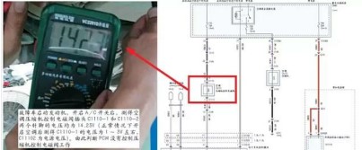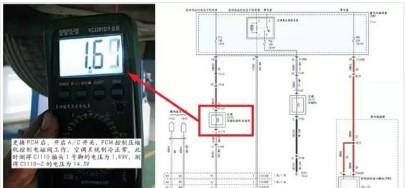 為了確認(rèn)是空調(diào)控制系統(tǒng)故障,還是執(zhí)行系統(tǒng)(離合器線圈及線路)故障,首先將壓縮機(jī)繼電器拔掉,使用跨接線直接短接繼電器3號腳和5號腳壓縮機(jī)電磁線圈執(zhí)行電路,此時(shí)壓縮機(jī)馬上吸合工作。同時(shí)經(jīng)檢測,離合器繼電器及保險(xiǎn)絲正常、線路也沒有短路、斷路現(xiàn)象。其次檢查空調(diào)壓縮機(jī)排量控制電磁閥的相關(guān)線路,啟動(dòng)發(fā)動(dòng)機(jī)及開啟A/C開關(guān),測量電磁閥插接器C1110的1號腳及2號腳的電壓均為蓄電池電壓14.23V,這說明電磁閥的供電線路正常,經(jīng)檢測從電磁閥C1110-1至PCM之間的線路也沒有短路、斷路現(xiàn)象。斷開C1110插接器測得電磁閥的電阻為15.8Ω,電磁閥沒有短路、斷路現(xiàn)象。通過以上的基本檢查說明開啟A/C開關(guān)后,PCM沒有控制壓縮機(jī)離合器繼電器及壓縮機(jī)排量控制電磁閥工作。如圖3、圖4所示。