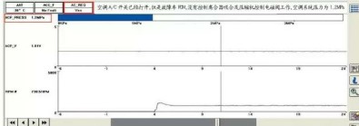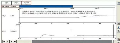 通過以上的檢測,PCM控制壓縮機(jī)繼電器吸合及壓縮機(jī)排量調(diào)節(jié)電磁閥工作的所有條件已經(jīng)全部滿足,PCM依舊沒有做出相應(yīng)的指令,是否是PCM內(nèi)部控制電路故障?將相同配置正常車輛PCM調(diào)換到故障車輛,做好PCM編程及匹配好啟動(dòng)模塊后,啟動(dòng)發(fā)動(dòng)機(jī),開啟A/C開關(guān),壓縮機(jī)離合器吸合、壓縮機(jī)排量調(diào)節(jié)電磁閥工作,正常制冷,空調(diào)系統(tǒng)正常工作。如圖7所示。