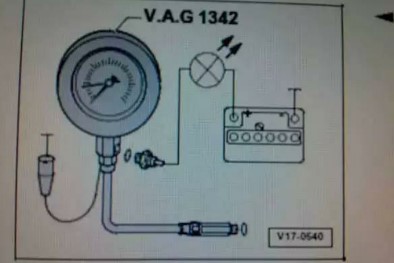 本著由簡到繁的原則進(jìn)行檢修,首先檢查機(jī)油液面,正常。將車預(yù)熱到工作溫度,熄滅發(fā)動機(jī),在機(jī)油濾清器上方找到油壓開關(guān),拆下油壓開關(guān)F1并將其旋入檢測設(shè)備V.A.G1342,并用該設(shè)備代替油壓開關(guān)旋入機(jī)油濾清器支架中。檢測設(shè)備的棕色導(dǎo)線搭鐵,將二極管檢測指示燈的輔助導(dǎo)線連接到蓄電池正極和油壓開關(guān)上,如圖1所示。打開點(diǎn)火開關(guān)但不起動發(fā)動機(jī),如果此時(shí)發(fā)光二極管點(diǎn)亮,說明油壓開關(guān)有故障。實(shí)際檢測發(fā)現(xiàn)發(fā)光二極管不亮,說明目前機(jī)油壓力開關(guān)狀態(tài)正常。