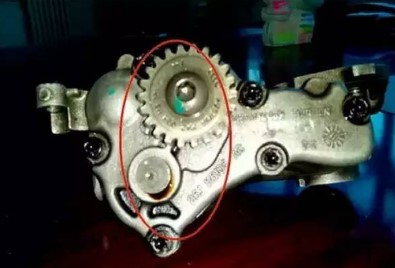 考慮到該車已行駛18萬km,于是進(jìn)一步拆下油底殼對機(jī)油泵進(jìn)行檢測。拆下機(jī)油泵后用手轉(zhuǎn)動,感覺還是有壓力的。但當(dāng)檢查泵軸時(shí)發(fā)現(xiàn),用手推動齒輪時(shí)會有軸向跳動,可見存在軸向間隙。如果將出油口堵住轉(zhuǎn)動機(jī)油泵,油液會從泵軸間隙中涌出,從而造成泄壓(圖2)。同時(shí),齒輪軸的軸向間隙過大,會使2個(gè)齒輪的嚙合面積減小,也會降低機(jī)油泵的泵油能力。故障排除更換機(jī)油泵和機(jī)油濾清器,同時(shí)清理油道,裝復(fù)后反復(fù)試車,故障現(xiàn)象沒有再出現(xiàn)。回顧總結(jié)該車故障現(xiàn)象始終處于偶發(fā)狀態(tài),只有當(dāng)發(fā)動機(jī)處于高溫狀態(tài)機(jī)油變得較稀時(shí),才會有一部分機(jī)油從泵軸間隙泄掉。如果此時(shí)發(fā)動機(jī)處于低速狀態(tài),機(jī)油泵的泵油壓力低,就會觸發(fā)機(jī)油壓力報(bào)警。一旦發(fā)動機(jī)轉(zhuǎn)速上升,機(jī)油泵的泵油壓力上升,故障現(xiàn)象又會被隱藏起來,甚至許多用戶都會忽略這個(gè)問題,也給維修人員排查故障增加了難度。但是,機(jī)油泵工作的好壞直接關(guān)系到發(fā)動機(jī)的壽命。隨著泵軸的磨損,間隙會不斷變大,機(jī)油泄漏越來越多,勢必會造成發(fā)動機(jī)各部件因缺少潤滑而過度磨損,因此必須對已經(jīng)磨損的機(jī)油泵進(jìn)行更換。