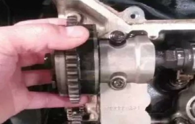 (4)拆下缸組1排氣凸輪軸調(diào)節(jié)電磁閥,測(cè)量線圈電阻2.3Ω,正常。懷疑電磁閥內(nèi)部卡滯,將缸組1與缸組2的排氣凸輪軸調(diào)節(jié)執(zhí)行器對(duì)調(diào),試車故障依舊。通過上述測(cè)試,驗(yàn)證缸組1排氣凸輪軸調(diào)節(jié)電磁閥及信號(hào)沒問題。此時(shí)懷疑凸輪軸調(diào)節(jié)執(zhí)行器本身或油路故障,拆開正時(shí)罩,檢查執(zhí)行器及油路正常,但是感覺缸組1排氣凸輪軸調(diào)節(jié)執(zhí)行器回位不好且曠量較大(圖4)。