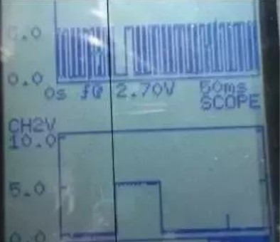 (8)將缸組1與缸組2噴油器對(duì)調(diào),故障依舊。用示波器分別測(cè)量故障車1缸上止點(diǎn)曲軸位置與排氣凸輪軸位置信號(hào)對(duì)應(yīng)關(guān)系(圖6),再測(cè)量一輛正常車(圖7),發(fā)現(xiàn)故障車錯(cuò)位大約兩個(gè)齒(12°)。